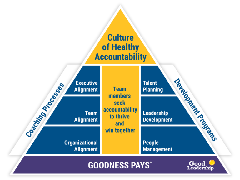 Good Leadership’s research has shown you can’t have an effective organization without good leadership. You can’t have good leadership without goodness. Healthy Accountability is the glue for how goodness pays.